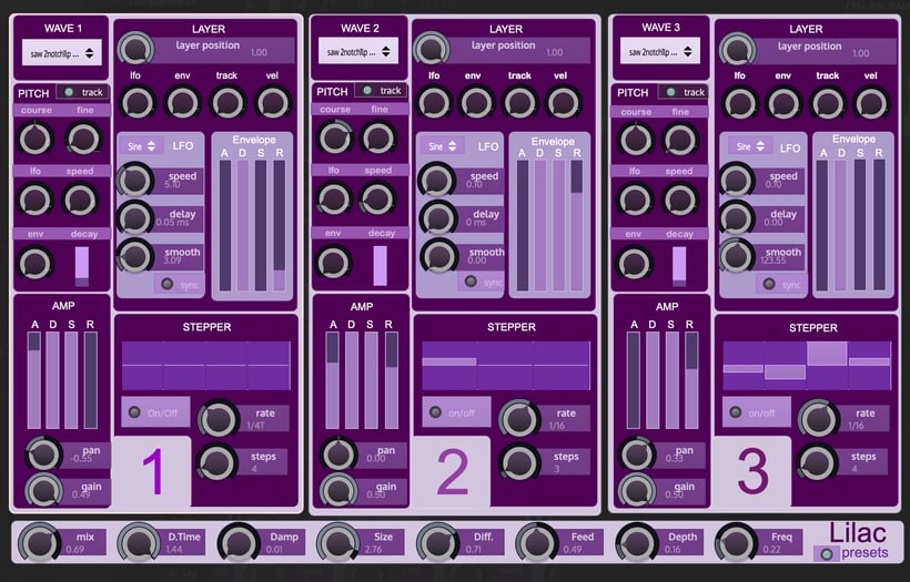 Lilac features 3 identical voices, each with a dedicated sequencer/arpeggiator, morphable waveforms, 2 LFOs, 2 envelopes & very sweet reverb effect.